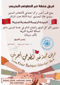 منح فريق جمعة خير التطوعي بالبحرين المركز الاجتماعي للأشخاص المسنين بسيدي علال البحراوي لقب أحسن مركز اجتماعي لرعاية المسنين بسيدي علال البحراوي لسنة 2025 تحت إشراف السيدة الرئيسة السعدية صنيبة.